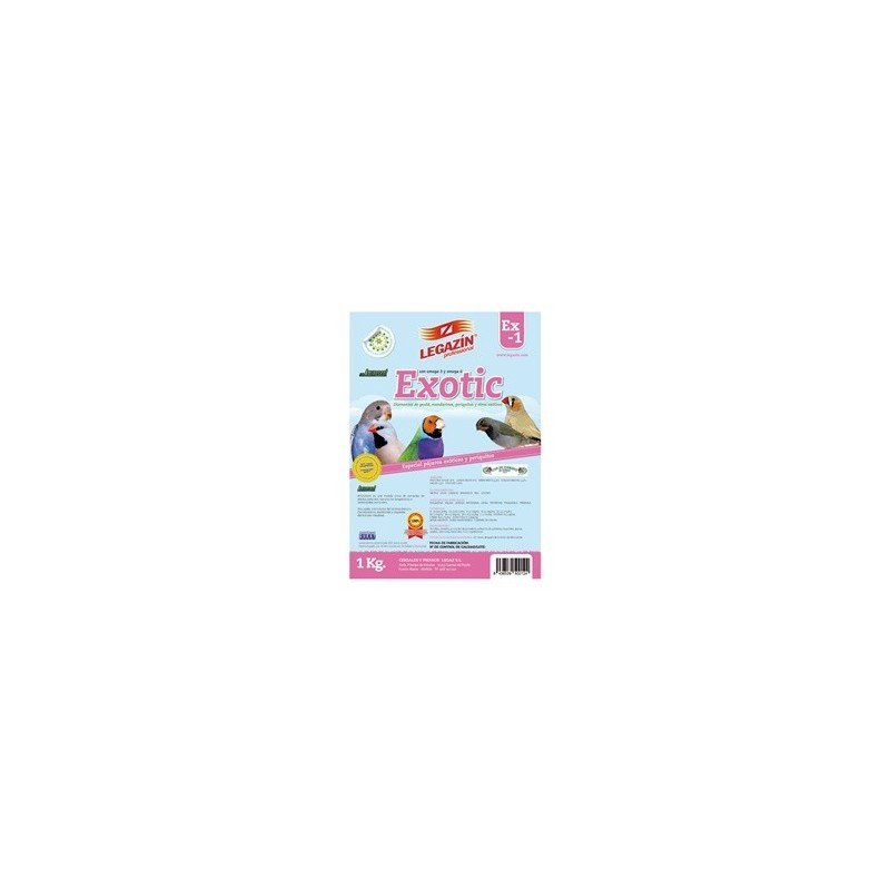 COMPOSICIÓN DEL LEGAZIN EX1 EXOTIC: Cereales, semillas, productos de panadería, extractos de proteínas vegetales También contiene grasas, aceites, lisina, metionina, vitaminas y minerales.