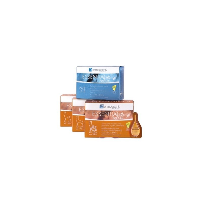 Essential 6® spot-on es la primera pipeta de dermo-cosmética para perros, gatos y pequeños mamíferos (conejos, hurones, cobayos, hámsters, ratas, ratones) y proporciona una solución sencilla y eficaz para los desequilibrios cutáneos (también denominados estados queratoseborreicos) y sus consecuencias: pelos apagados y quebradizos, manto seco o graso, malos olores, etc.