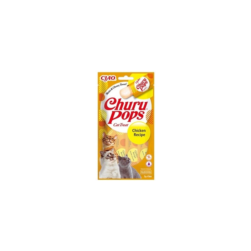 Descripción: Churu Pops, Divertidos snacks diseñados para darles de comer directamente desde el empaque a los gatos y fortalecer los lazos entre ellos y sus dueños.