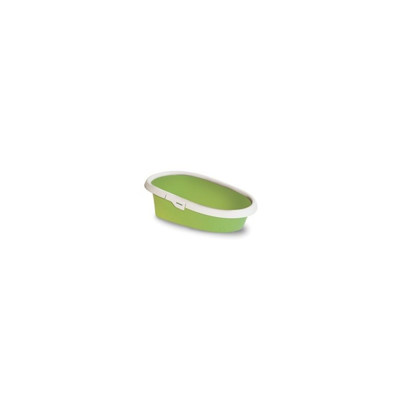 Bandeja ovalada con paredes posteriores un poco más altas para evitar que salga tanta arena durante su uso.