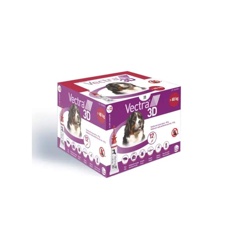 VECTRA 3D es un producto que actúa por contacto y gracias a su efecto repelente protege frente a los principales parásitos que afectan a las mascotas. Vectra 3D es eficaz frente a pulgas, garrapatas, flebotomos, mosquitos y mosca del establo.