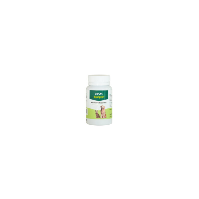 Alimento complementario para perros y gatos que aporta azufre biodisponible. El azufre es un mineral imprescindible para la síntesis de aminoácidos, y la formación de proteínas, enzimas y tejido conectivo. El MSM estimula la reparación de la piel dañada, suaviza el tejido cicatricial, aumenta la resistencia a las alergias, reduce el dolor y la inflamación.
