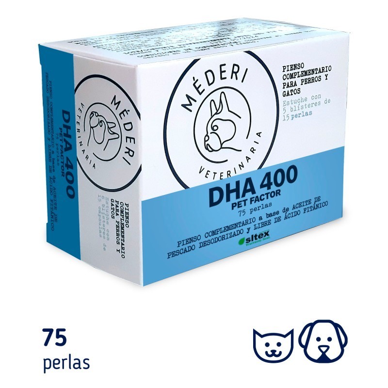 DHA 400 PET FACTOR: Estuche de 5 blísteres de 15 perlas (75 perlas)