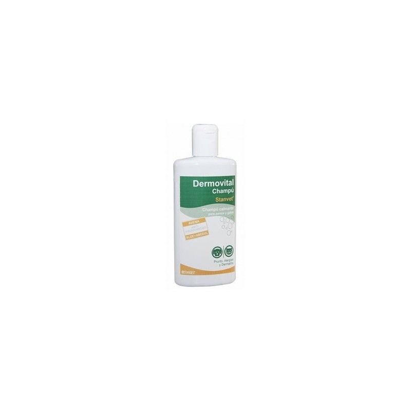 El champú Dermovital está pensado para los animales con dermatitis atopica y prurito de origen desconocido, siendo formulado específicamente como champú calmante. Las indicaciones principales, a base de productos naturales, son: lareestructuración cutánea, la disminución de la carga alergénica, el efecto antipruriginoso y la hidratación.