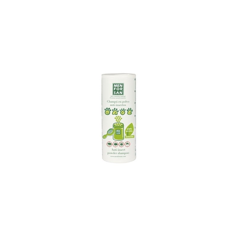 Champú en polvo para perros, gatos, conejos, cobayas y hurones indicado para el mantenimiento y la higiene del pelaje sin la utilización de agua. Su fórmula contiene tensioactivos naturales que eliminan el mal olor desodorizando e higienizando el pelaje. Contiene extracto de MARGOSA, insecticida natural, que previene y repele todo tipo de insectos, pulgas, garrapatas mosquitos y ácaros. Recomendado para su uso para cachorros, animales convalecientes, en gestación, muy ancianos, con miedo al agua o para la limpieza en los duros días del invierno cuando el baño habitual no es muy indicado.