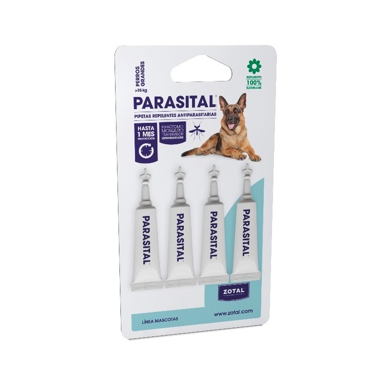PARASITAL® Pipetas perros grandes de 25 a 40 kg, gracias a su composición a base de ingredientes activos naturales, actúa con eficacia contra los eternos enemigos de nuestras mascotas: los parásitos externos. Garrapatas, pulgas, moscas e incluso el mosquito transmisor de la Leishmaniasis, dejarán de ser un problema, proporcionando bienestar y tranquilidad tanto a dueños como a mascotas