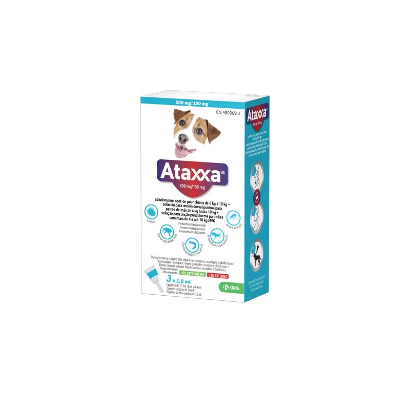 Ataxxa es un tratamiento en pipetas para perros que previene y trata infestaciones por pulgas y garrapatas, así como también ofrece un efecto repelente contra mosquitos y flebotomos.