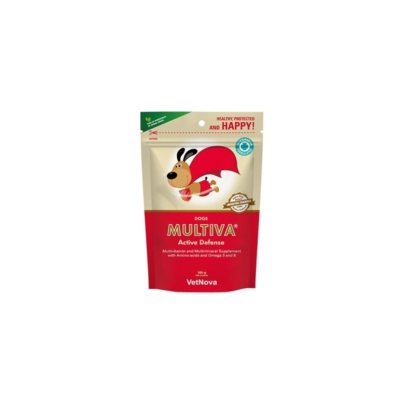 Multiva Active Defense Dogs es un suplemento multivitamínico y multimineral con aminoácidos, antioxidantes, Omega 3 y 6 formulado en chews de alta palatabilidad.
