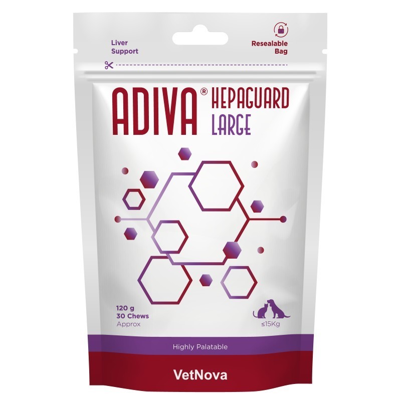 Adiva Hepaguard es un alimento complementario con vitaminas del grupo B, vitamina E, selenio, zinc y extractos de Silybum marianum (cardo mariano) y Cynara scolymus (alcachofa), formulado en chews altamente palatables para ayudar a mantener la función hepática.