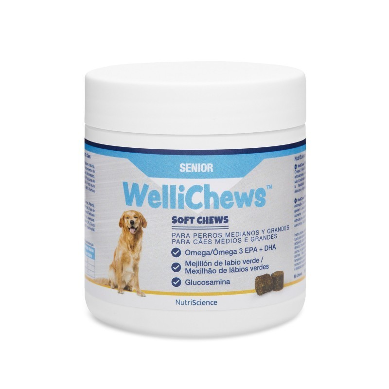 NutriScience WelliChews Senior Multivitamínico son masticables blandos que contienen Omega 3 EPA DHA, mejillón de labio verde y glucosamina. Favorece la salud de las articulaciones, el estado del pelaje y el bienestar general. Refuerza la inmunidad, la salud cardiovascular y proporciona un apoyo natural a las articulaciones. Favorece la flexibilidad y la movilidad. Fácil de administrar y altamente palatable.