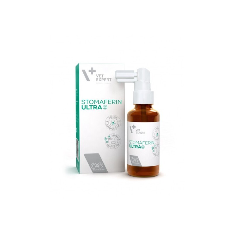Stomaferin ULTRA ayuda completa y cómoda para mantener la salud bucal de perros o gatos. Ayuda en la desinfección de la cavidad bucal y en la estimulación de la respuesta inmunitaria local. El producto ofrece una acción bidireccional, gracias a su combinación única de dos ingredientes activos: clorhexidina y lactoferrina.