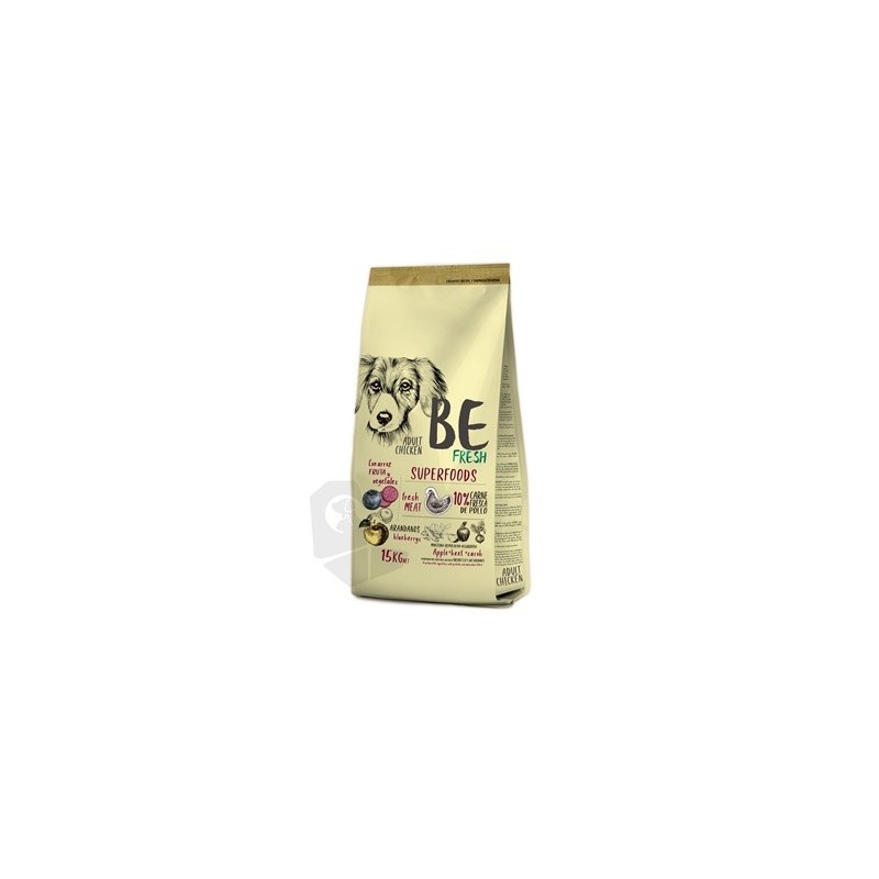 COMPOSICIÓN Be Fresh Adult Pollo: Ave 20% (Pollo fresco 10%. Proteína deshidratada de ave 10%). Arroz. Maíz. Trigo. Cebada. Proteína animal deshidratada. Grasa de ave. Hidrolizado de hígado de ave. Algarroba. Pulpa de manzana. Harina de pescado. Pulpa de remolacha. Aránda- nos. Sustancias minerales. Levaduras.