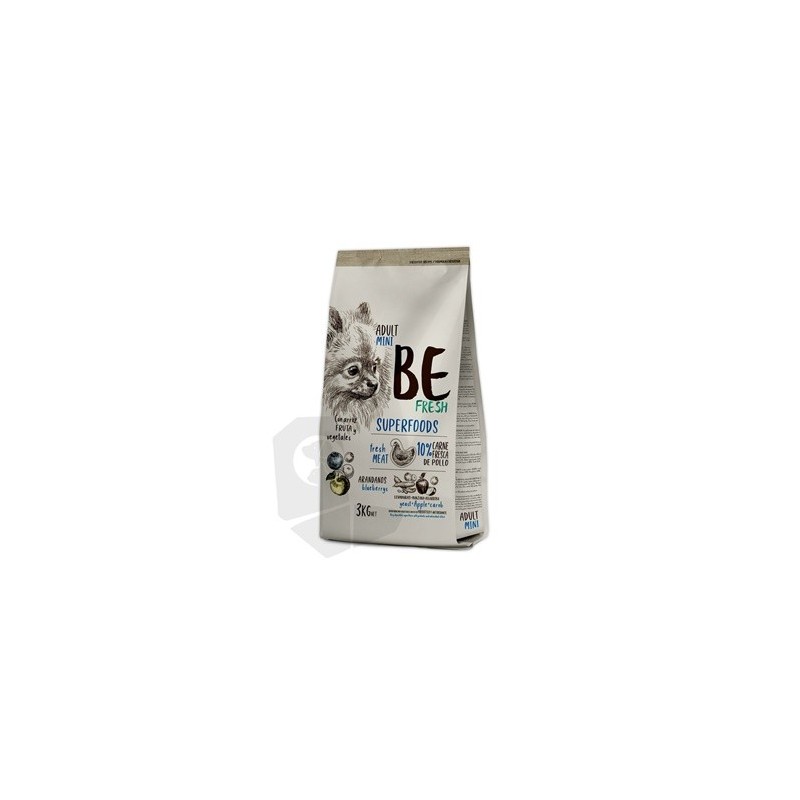 Composición Be Fresh Adult Mini: Proteína deshidratada de ave 24%. Trigo 18%. Salvado de arroz 13%. Pollo fresco 10%. Grasa de ave 9,5% ( fuente de ácidos grasos Omega 6). Proteína animal deshidra- tada 6,5%. Cebada 5%. Maíz 4,5%. Arroz 4,5%. Hidrolizado de hígado de ave 2,5%. Pulpa de manzana 0,5%. Levaduras 0,5% (fuente de MOS). Garrofa 0,4%. Proteína deshidratada de pescado. Aceite de pescado (fuente de ácidos grasos Omega 3). Minerales. Arándanos 0,1%.