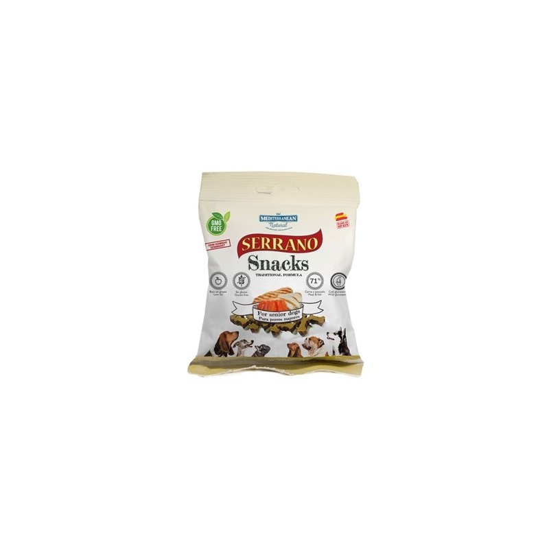 Los Serrano Snacks de MEDITERRANEAN NATURAL, delicadamente cortados en pequeñas cantidades con forma de huesito, garantizan la seguridad de la mascota, mantienen su pureza y todos los nutrientes, reflejan la dieta natural y contienen al menos 70 % de carne