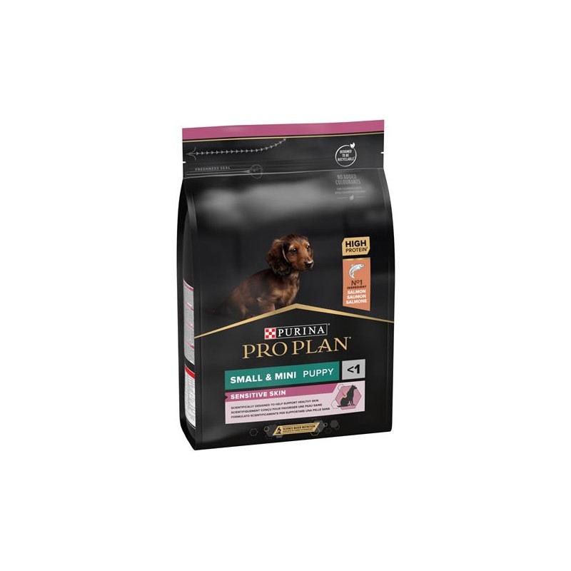 PURINA PRO PLAN Puppy Small & Mini Sensitive Skin rico en Salmón es un alimento completo para cachorros de razas pequeñas y miniatura con piel sensible. También es adecuado para perras gestantes / lactantes. Diseñado científicamente para favorecer un pelaje brillante y una piel saludable.