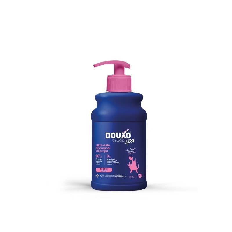 El champú antipicores Douxo Spa limpia suavemente respetando la piel sensible e irritada. Su fórmula suave, enriquecida con extractos de plantas naturales, hidrata y protege la piel de tu perro. Gracias a su acción calmante, calma el picor ligero y deja el pelaje suave, brillante y agradablemente perfumado después de cada baño.