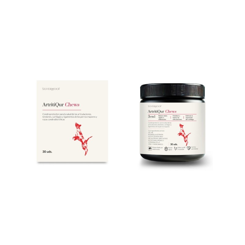 Condroprotector en chews de alta calidad que favorece la salud de las articulaciones, tendones, cartílagos y ligamentos de los perros mayores. Acción 3 en 1: Reduce dolor, rigidez e inflamación; Fortalece y lubrica las articulaciones y Estimula la reparación del cartílago
