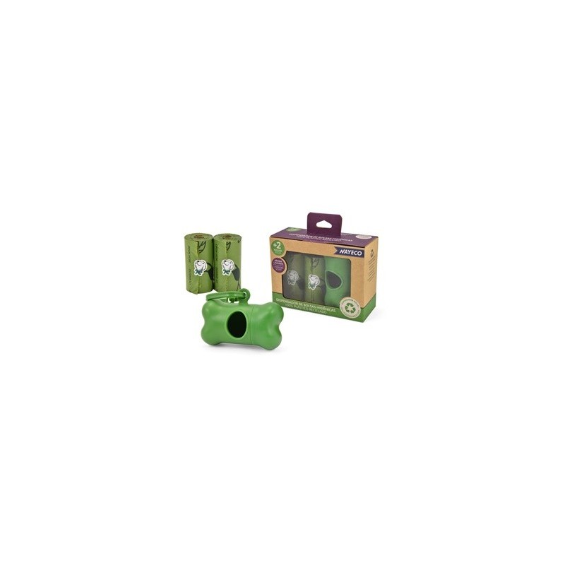 Portabolsas en forma de hueso, fabricado con plástico reciclado. Incluye dos rollos de bolsas degradables gracias a los aditivos EPI que aceleran la descomposición facilitando una degradación más rápida. Con aroma a lavanda.