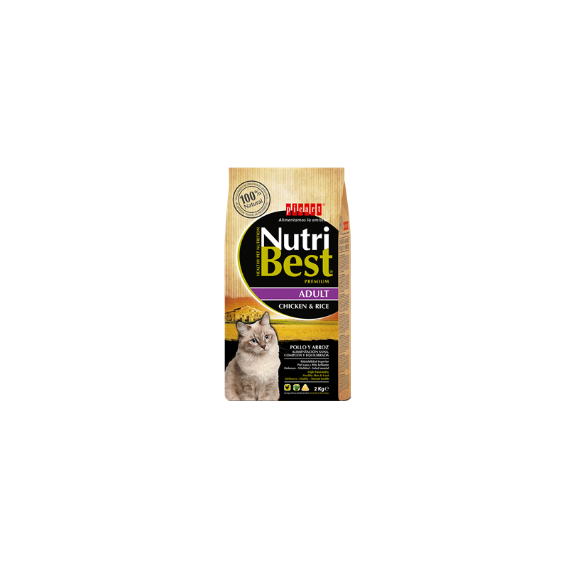 NutriBest Cat Chicken & Rice es un alimento Premium formulado por nuestros expertos en nutrición y veterinarios para que tu gato disfrute de una salud óptima. Contiene Algas Marinas del Atlántico Norte para una piel y un pelo sanos y cuidados.