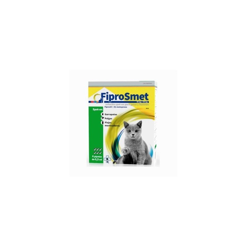 FiproSmet Gatos y Hurones 6 Pipetas es un antiparasitario en pipeta Spot-on para el tratamiento por infestaciones de pulgas, garrapatas y/o piojos masticadores en el animal. así como sus huevos en el ambiente del mismo, siendo una gran opción para desparasitar externamente a las mascotas y evitar la transmisión de enfermedades a través de estos parásitos.