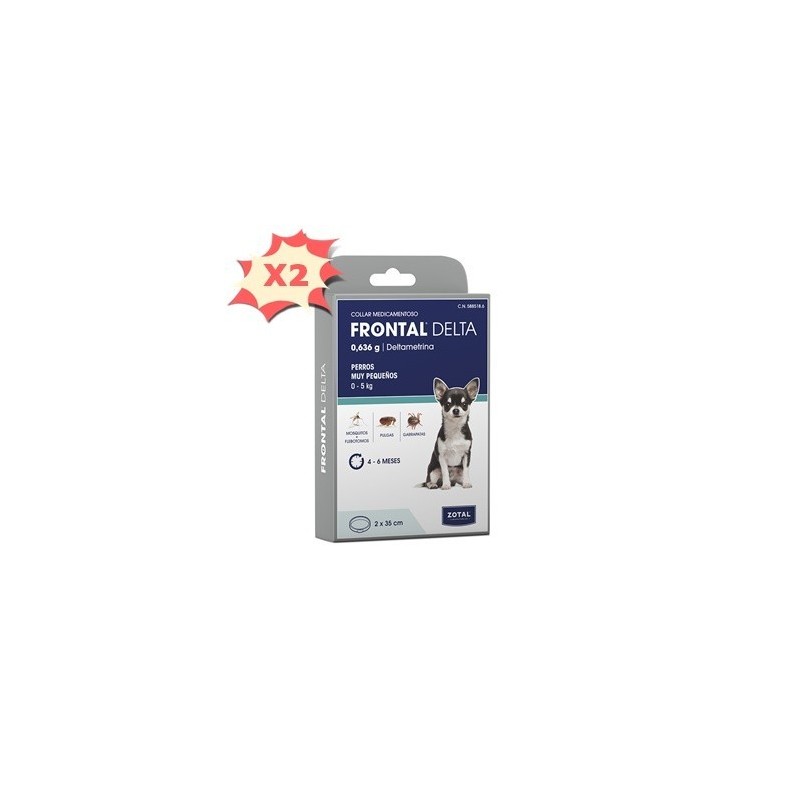 El Collar FRONTAL DELTA posee efecto repelente (anti-alimentación) frente a flebotomos (Phlebotomus perniciosus) y mosquitos culícidos (Culex pipiens) durante 5 y 6 meses; por lo que se puede considerar como parte de un programa para la prevención de leishmaniosis y mosquitos culícidos del complejo Culex pipiens. Indicado además para la prevención de las infestaciones producidas por garrapatas y pulgas durante 6 y 4 meses.
