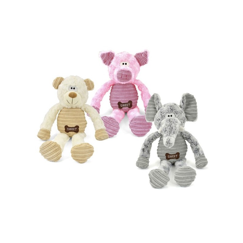 Entrañable peluche suave y agradable al tacto de 37cm. Disponible en tres animales diferentes de colores variados: beige, rosa y gris. Diferentes texturas para mayor motivación y sonido en su interior.